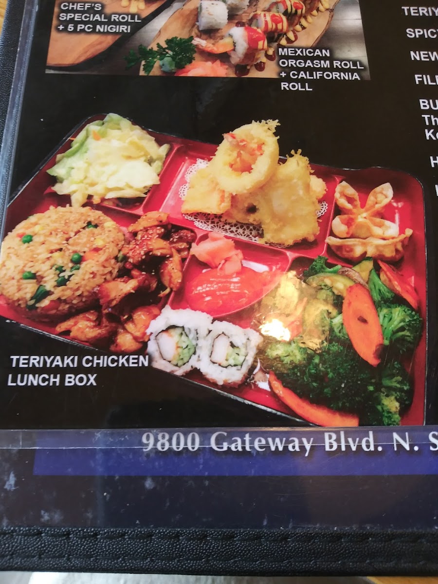 Teriyaki chicken with side of tempura, gyoza, crab meat puff, 2 pc California roll and rice.